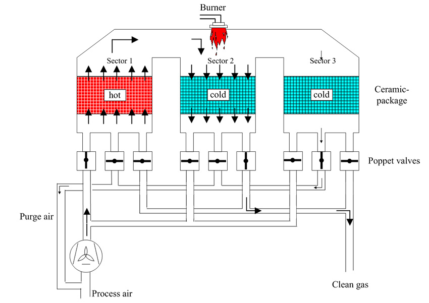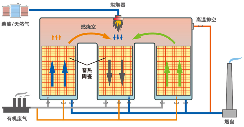 其原理是把有機廢氣加熱到760℃以上,使廢氣中的VOC在氧化分解成二氧化碳和水,氧化產(chǎn)生的高溫氣體流經(jīng)陶瓷蓄熱體,使陶瓷體升溫而“蓄熱”,此“蓄熱”用于預(yù)熱后續(xù)進入的有機廢氣,從而節(jié)省廢氣升溫的燃料消耗。陶瓷蓄熱體應(yīng)分為兩個(含兩個)以上的室體,每個蓄熱室依次經(jīng)歷蓄熱—放熱—清掃等程序,周而復(fù)始,連續(xù)工作。